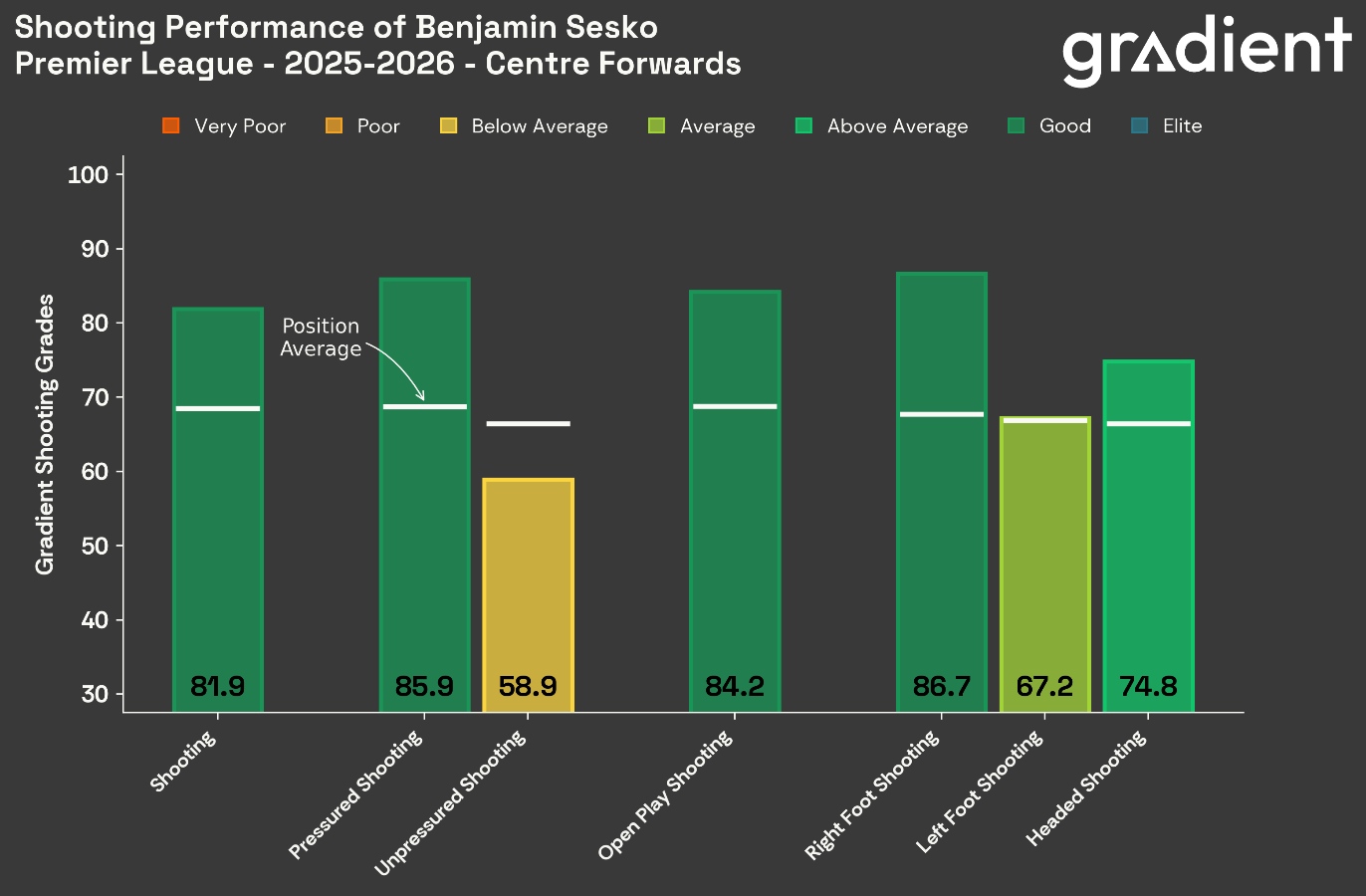 Sesko recorded his fastest speed (35.87km/h) of the season at Everton, presumably while leaving James Tarkowski for dead to get on the end of Bryan Mbeumo’s pass for United’s winner. His shooting grades, though, suggest he needs to slow down a bit when he’s not under pressure.